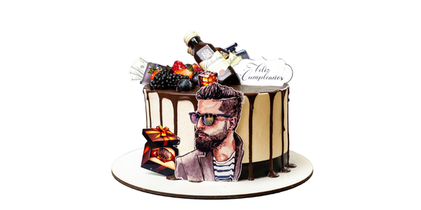 Tarta para hombres chocolate caído y frutas con 2 botellas de Whisky